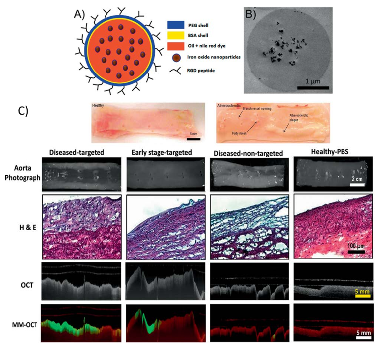 MNPs can also be loaded in a magnetic microsphere (MS) before delivery. Coated with polyethylene glycol (PEG), the in vivo circulation time of MSs in the blood stream can be increased. Functionalized with Arg-Gly-Asp (RGD) peptide, the magnetic MS can target αvβ3 integrins overexpressed in diseased atherosclerotic aortas.
