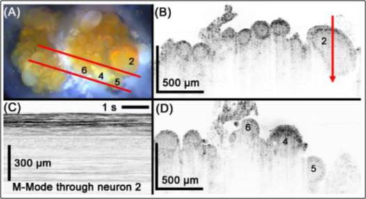Optical coherence tomography of the Aplysia abdominal ganglion showing dynamic depth-resolved changes in optical scattering that correlate to electrical activitiy. (A) Photograph of exposed ganglion. (B,D) Cross-sectional OCT images along the two red lines indicated in (A). (C) M-mode image (fixed depth scan over time) through neuron 2 in (B, red line) showing transient scattering changes at various depths.