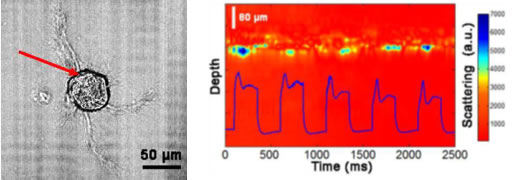 Transient optical scattering changes correlated to electrical activity in a single Aplysia neuron. (Left) En face optical coherence microscopy based on intrinsic optical scattering properties in this single cell. (Right) Optical scattering changes occurring over time at the site indicated by the red arrow. The transient scattering intensity correlates with the electrical activity indicated by the blue trace.