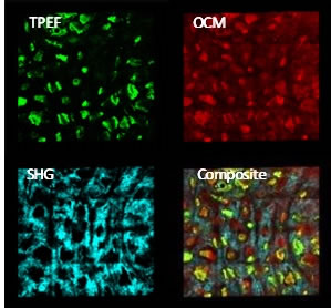 Advanced integrated multimodal microscopy of cuttlefish skin revealing the intricate array of chromatophores (cells) and collagen that are used to regulate the optical properties, patterns, and textures of their skin. TPEF: Two-photon excited fluorescence microscopy of autofluorescent cells. OCM: Optical coherence microscopy of the intrinsic scattering properties of cells. SHG: Second harmonic generation microscopy showing the collagen fiber network used to dynamically alter the textural features on the skin. Composite image shows all three modalities overlaid, revealing their spatial relationship. All images were captured simultaneously using our integrated microscope.