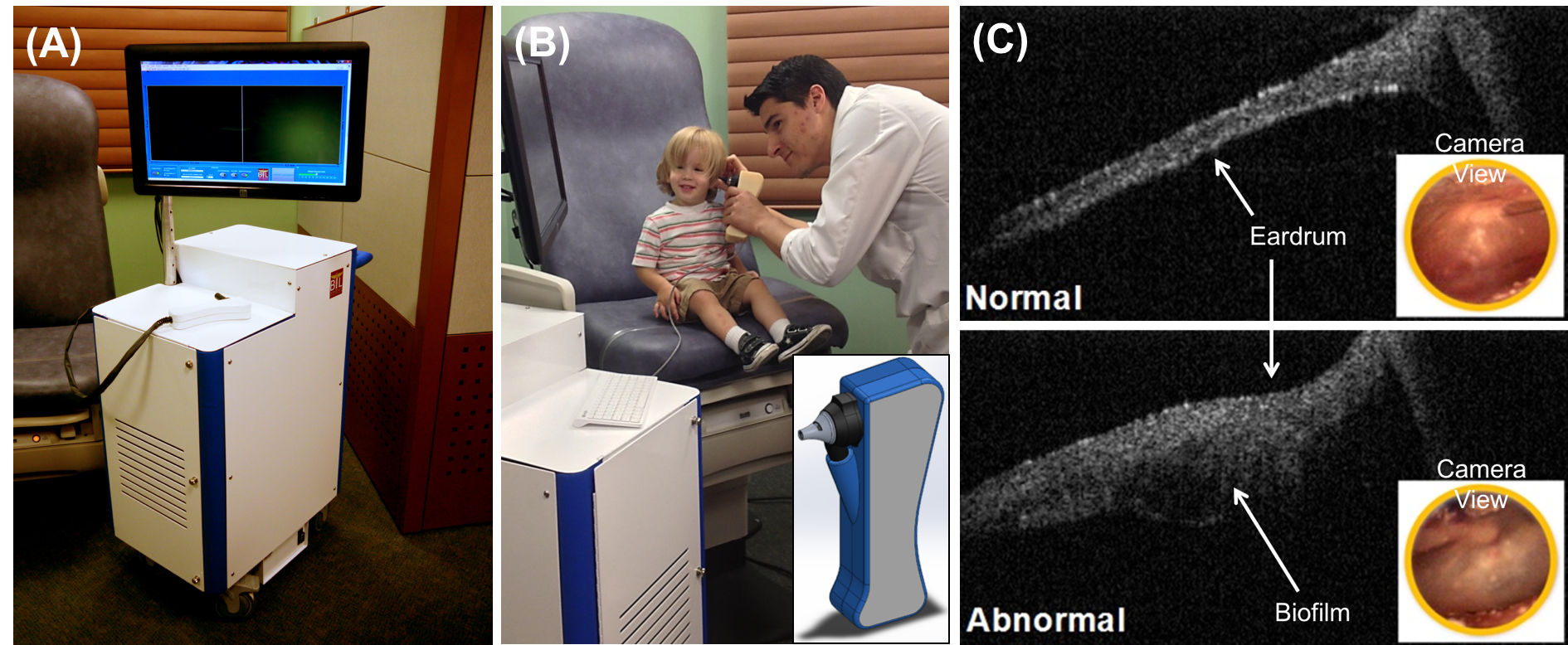 (A) Portable, handheld Primary Care Imaging (PCI) OCT system, (B) demonstration of PCI OCT system for ear imaging and zoomed in handhled probe, and (C) depth-resolved view of normal and abnormal middle ear with standard otoscopic view in the bottom right.
