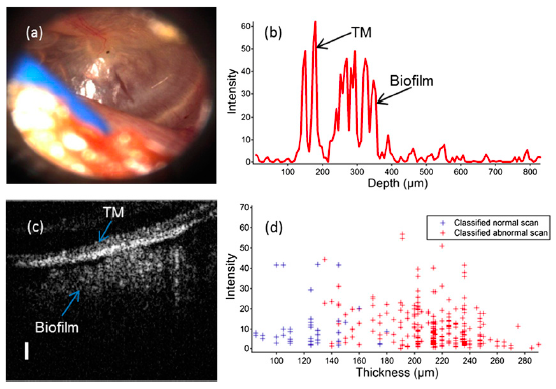 (A) Otoscopic image of an eardrum with chronic otitis media, (B) representative LCI A-scan showing the tympanic membrane and biofilm, (C) cross-sectional OCT B-scan image, and (D) classification of the data showing a relationship between thickness and abnormality of the middle ear.