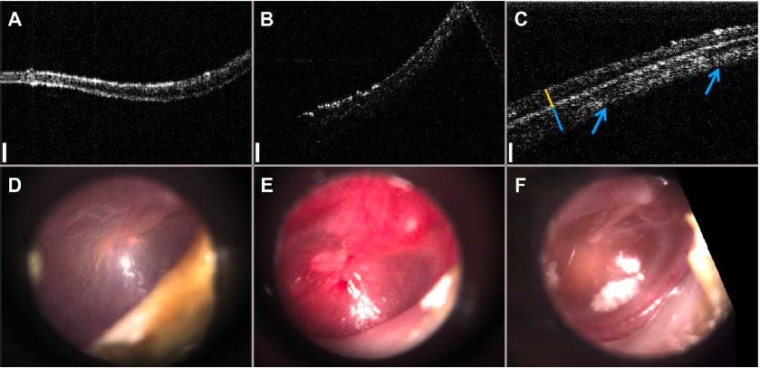 Representative OCT images: (A) normal, (B) acute otitis media, (C) chronic otitis media, and representative en face images from an otoscope: (D) normal, (E) acute OM, (F) chronic OM. Scale bars represent 150 microns in depth. (A-C) provide quantitative distinction among different cases.